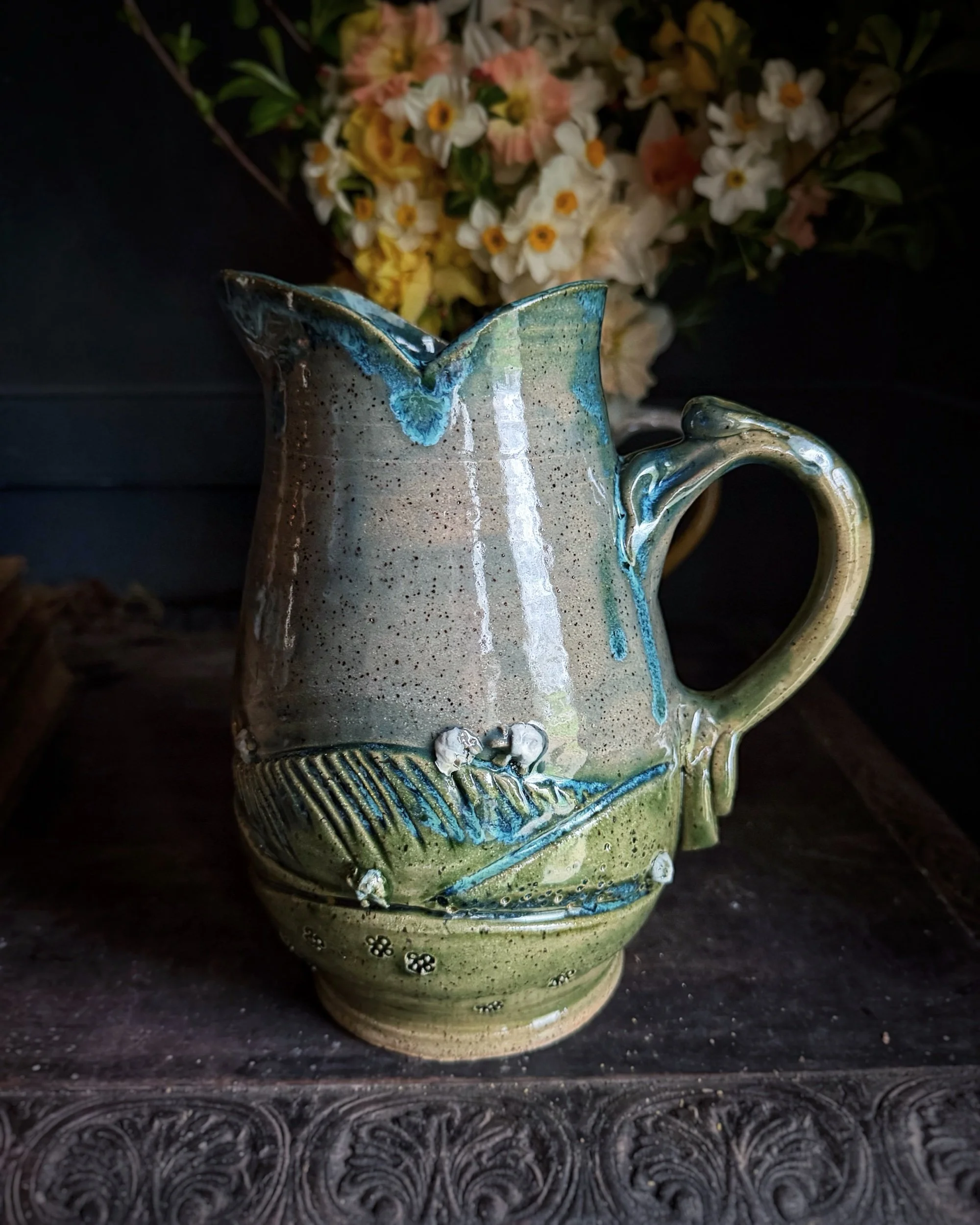 This mug features a flock of tiny sheep and pastoral scenes of green pastures around the base.