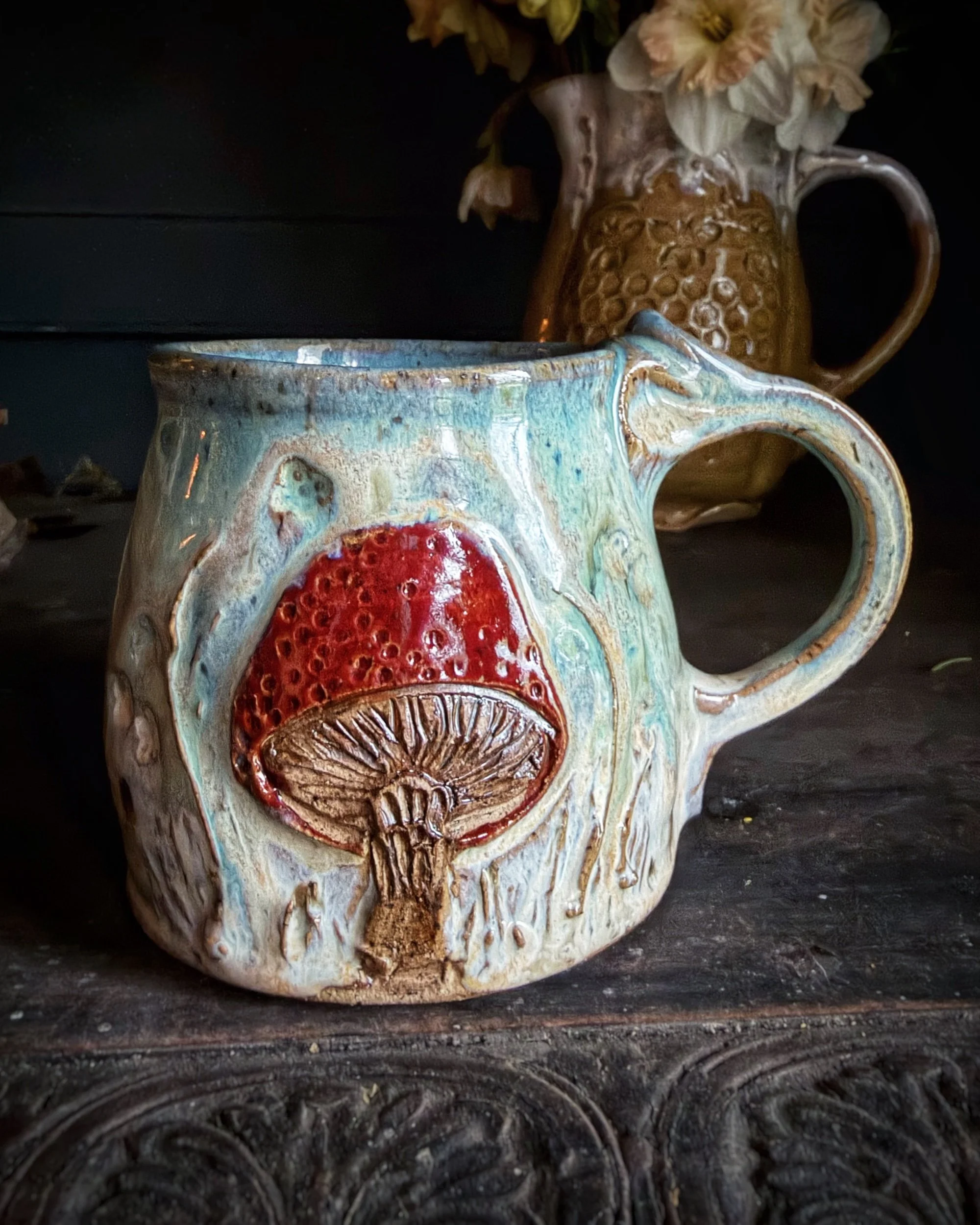 Each of these cozy mugs features a bright red mushroom nestled in a grassy corner hand carved on it. Holds apps. 12 oz.